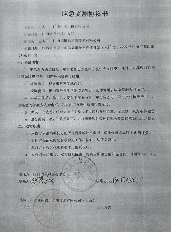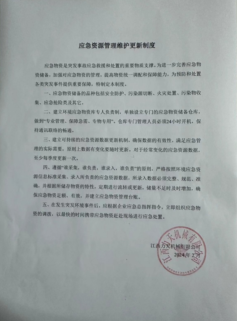 根據上述對應急資源滿足性分析的結果來看,江西力天機械有限公司內部配備有一定的應急人力、物力及財力資源,現有的應急資源能滿足應急的需求